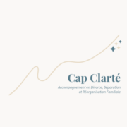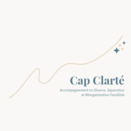 Logo Cap Clarté sur fond transparent, illustrant une courbe ascendante beige vers des étoiles bleues, avec le slogan : votre accompagnante en divorce, séparation et réorganisation familiale.